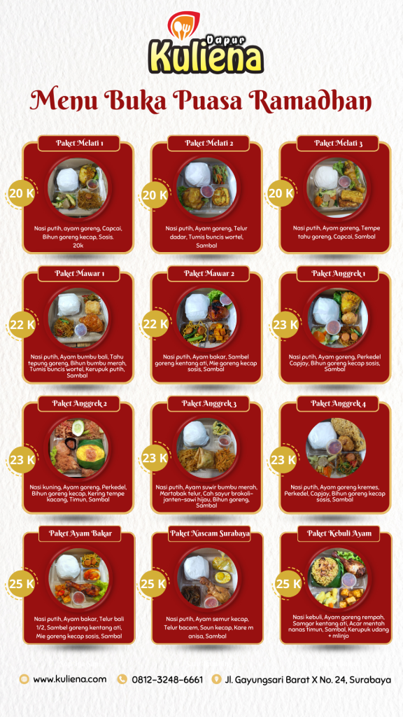 Pada Bulan Suci Ramadhan ini Kami berinovasi dan berkembang dengan membuat Paket Catering nasi kotak berbuka puasa dan sahur. Anda bisa dengan mudah pesan catering nasi kotak surabaya dan sidoarjo dengan mudah dan harga terjangkau. Paket yang kami sediakan bisa kami antar ke tempat pemesanan anda atau anda bisa ambil. Banyak pilihan menu nasi kotak buka puasa yang enak dengan harga terjangkau yang dapat anda pesan.