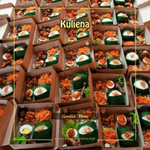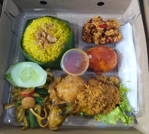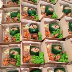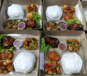 - Kepraktisan dan Efisiensi : Nasi kotak menyajikan hidangan lengkap dalam satu paket, sehingga memudahkan penyajian dan distribusi makanan untuk banyak orang tanpa perlu repot.