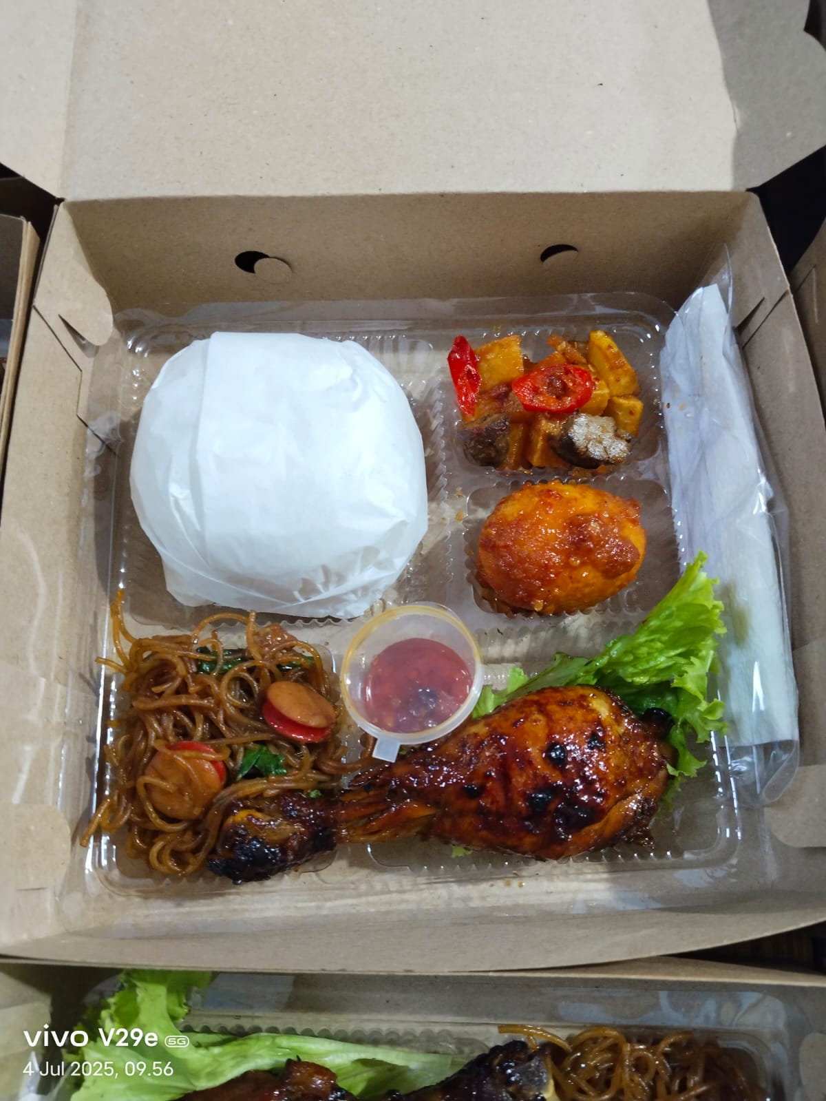 Kami melayani Pemesanan Nasi Kotak Ayam Bakar area Surabaya dan sekitarnya dengan berbagai menu. Menu khas andalan kami adalah nasi kotak ayam bakar. Menu ini memiliki variasi lain yaitu ayam goreng, bebek bakar dan bebek goreng.